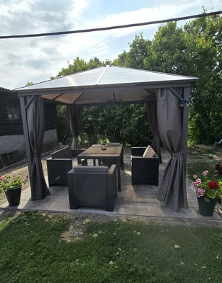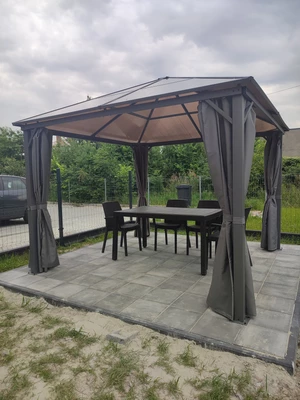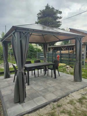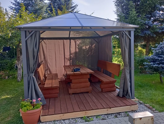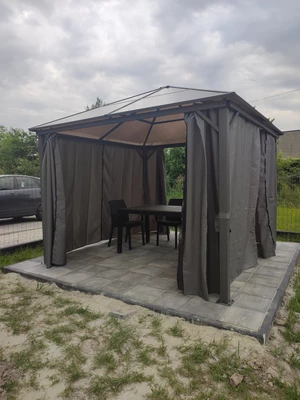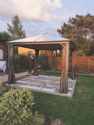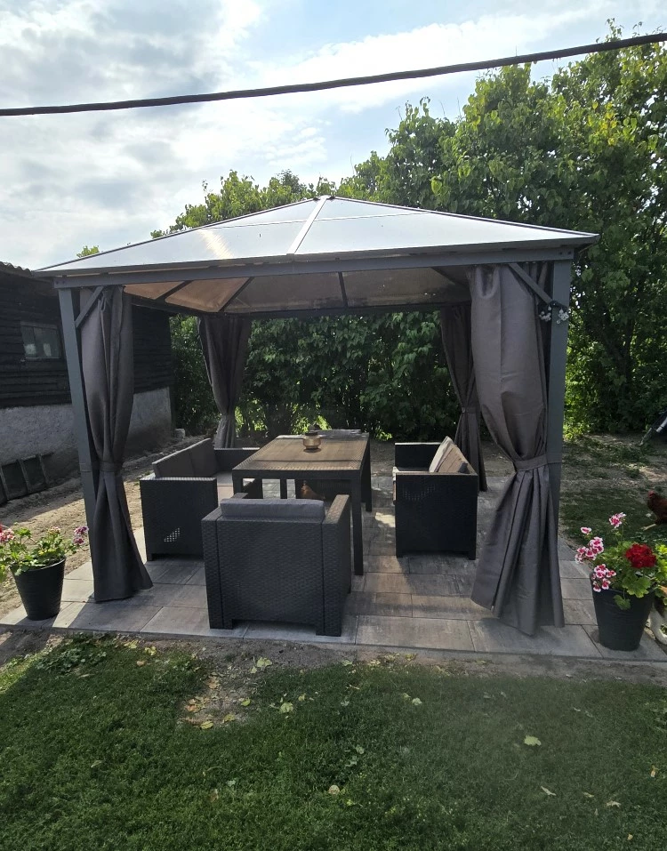 Het prieel is gemakkelijk in elkaar te zetten, de poten zijn stabiel, het dak is licht, het bruine licht dringt het interieur binnen en creëert een aangenaam gevoel van schaduw, en de gordijnen zijn handig als bescherming tegen de wind. Ik raad de aankoop van een tuinhuisje van harte aan.